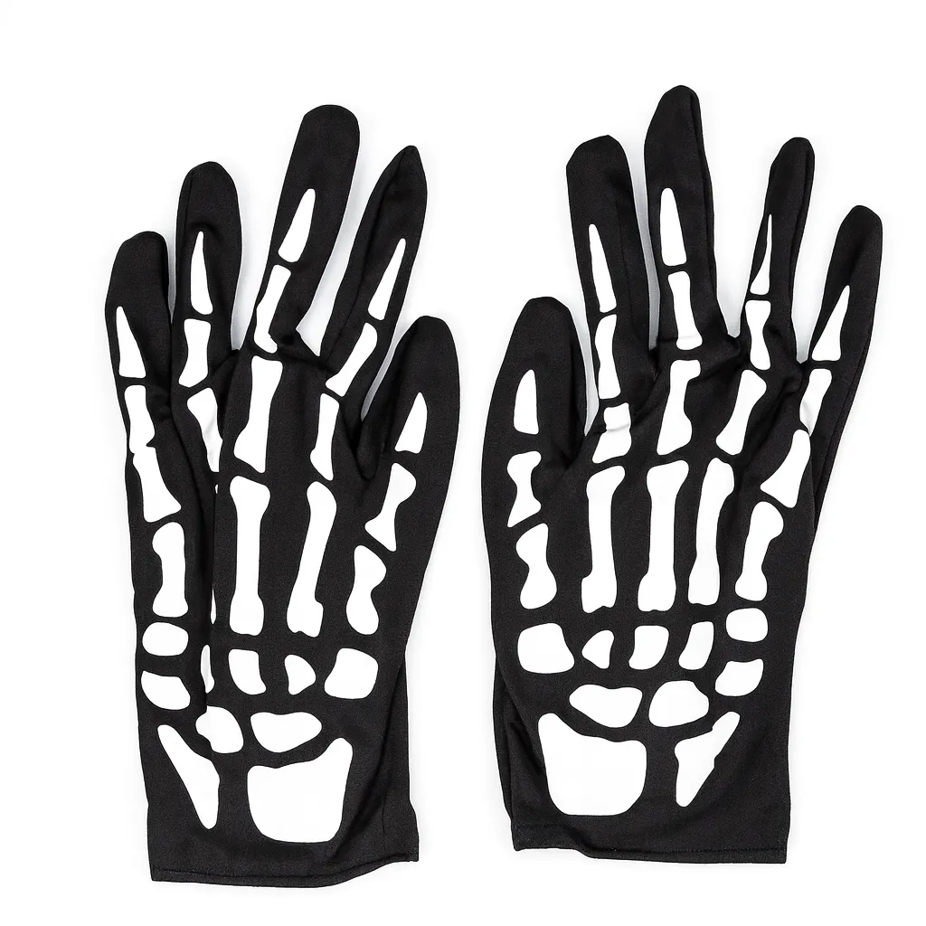 دستکش طرح اسکلت چاپی روی پارچه مشکی، فری سایز و مناسب برای بزرگسالان. بهترین انتخاب برای هالووین، نمایش، سینما و ست کردن با لباس و ماسک اسکلت.
